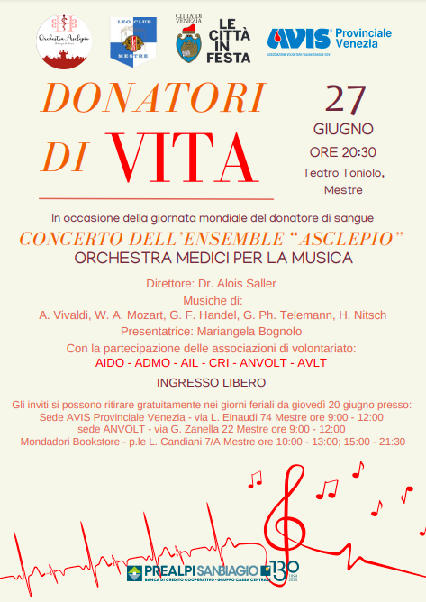 La serata sarà presentata da Mariangela Bognolo: durante la prima parte ci saranno gli interventi del presidente Avis e dei dirigenti e dei medici dell’Ulss 3 Serenissima; nella seconda parte ci sarà il concerto dell’ensemble “Asclepio – Orchestra Medici per la musica”, ovvero l’orchestra sinfonica nazionale italiana composta da medici che lavorano negli ospedali del Veneto. L’orchestra, che eseguirà musiche di A. Vivaldi, W. A. Mozart, G. F. Handel, G. Ph. Telemann, H. Nitsch, sarà diretta da Alois Saller. L’ingresso è gratuito ma è necessario ritirare gli inviti in questi giorni a Mestre nella Sede Avis provinciale Venezia – via L. Einaudi 74 Mestre, dalle ore 9 alle 12; nella Sede Anvolt – via G. Zanella 22 dalle ore 9 alle 12; e alla Mondadori Bookstore – p.le L. Candiani 7/A , dalle ore 10 alle 13 e dalle 15 alle 21.30 e, infine, da un’ora prima dell’inizio dello spettacolo alla biglietteria del Teatro Toniolo.