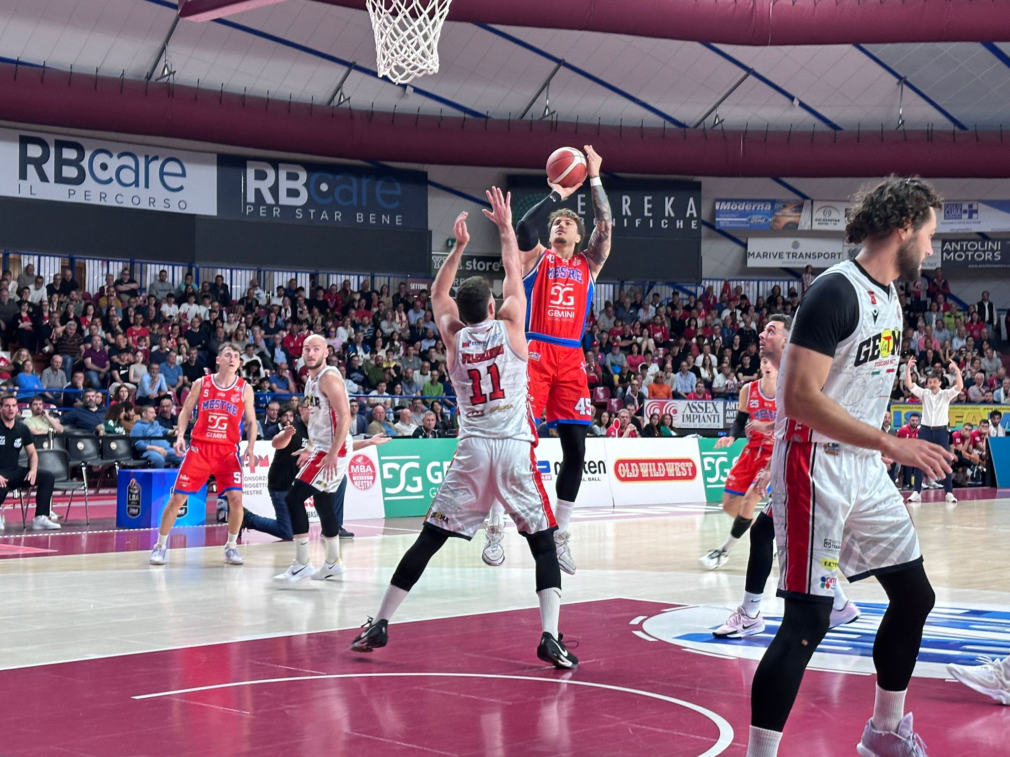 Primo quarto. Brambilla e Toscano, due bombe per parte. Bedin e Giordano da due. Inizio equilibrato, 5-5. Giro in lunetta per Burini. Dopo 2′, 5-7. D’Alessandro ancora da lontano e Bedin vicino al canestro 7-12. Mazzucchelli prova a dare lo slancio, ma ai rimbalzi è meglio la formazione ospite 9-14. Galmarini accorcia le distanze, 11-14, ma è sempre la fisicità di Bedin che si fa sentire. Toscano da oltre l’arco, 11-19. Fase difficile per i padroni di casa che chiamano time-out a 3’19” dalla conclusione del primo periodo. Si torna in campo e Giordano mette a segno due punti. Bella azione per Di Pizzo che aggiorna il risultato sul 13-21. Si gira bene Aromando che trova altre due punti, 15-21. Chiarini trova pure lui il tiro pesante, 15-24. Altri due tiri dalla lunetta e Mestre va a -11. Sulla sirena Gemini Mestre-Gema Montecatini 18-26. Ben 4/8 da tre la compagine toscana, contro l’1/4 dei padroni di casa.