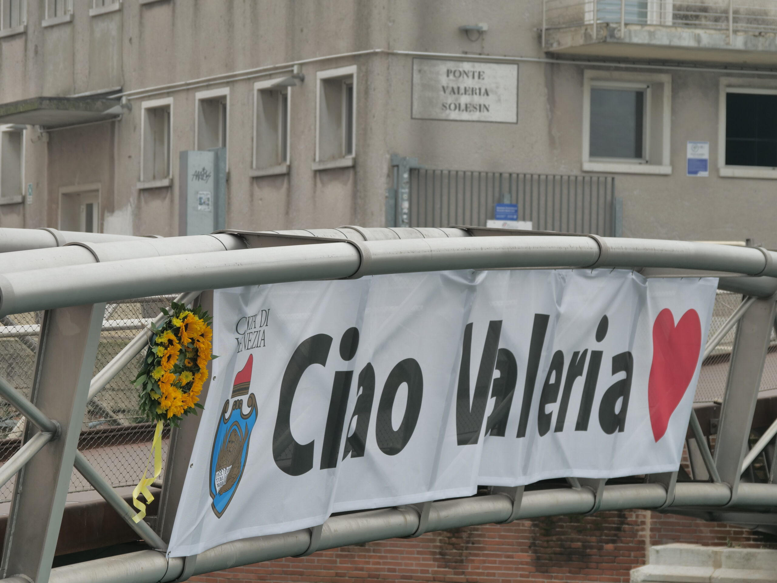 Così il Comune, dopo il ricordo di ieri, è tornato sul ponte che ha voluto dedicare alla studentessa. Oggi il giallo dei girasoli a lei tanto cari, si accompagna allo striscione “Ciao Valeria”.