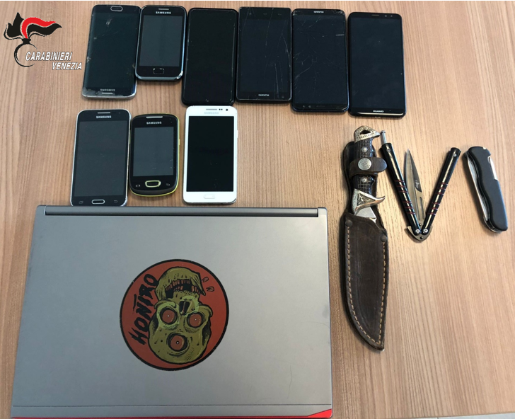 L’attività di polizia giudiziaria svolta dall’Arma di Jesolo, con l’ausilio dei colleghi della Stazione di Padova Principale, ha permesso di rinvenire e sequestrare tre armi bianche (un pugnale, un coltello a “farfalla” ed uno tipo svizzero), 9 telefoni cellulari ed un PC. Trovato anche poco più di un grammo di marijuana.