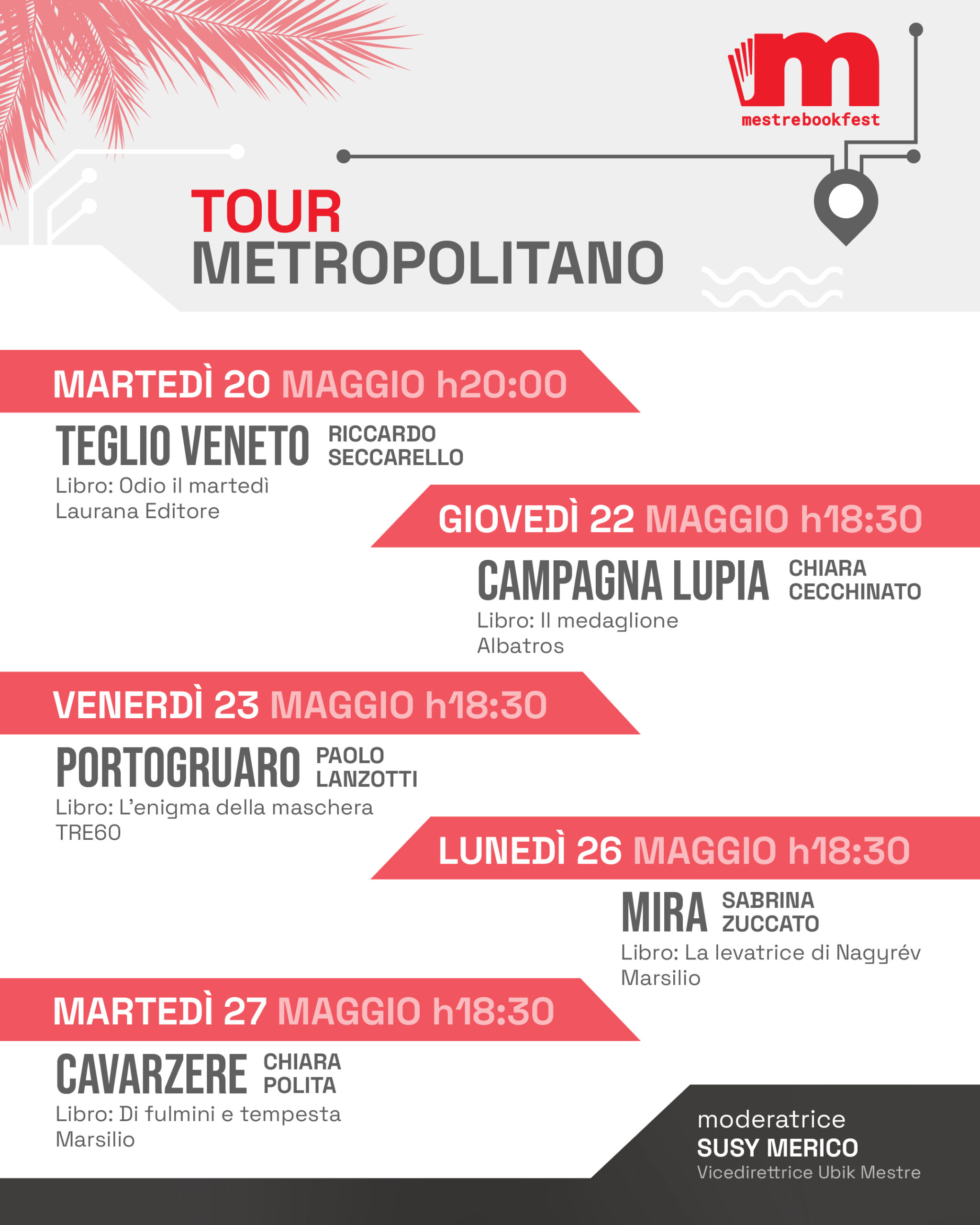 Se il cuore di Mestre sarà teatro delle presentazioni degli scrittori più illustri cinque comuni della Città metropolitana quali Teglio Veneto, Campagna Lupia, Portogruaro, Mira e Cavarzere, dal 20 al 27 maggio faranno da prologo con altrettante presentazioni in spazi culturali cittadini con autori locali e con storie che nascono dal territorio per quello che è stato ribattezzato il Tour metropolitano del Mestre Book Fest.