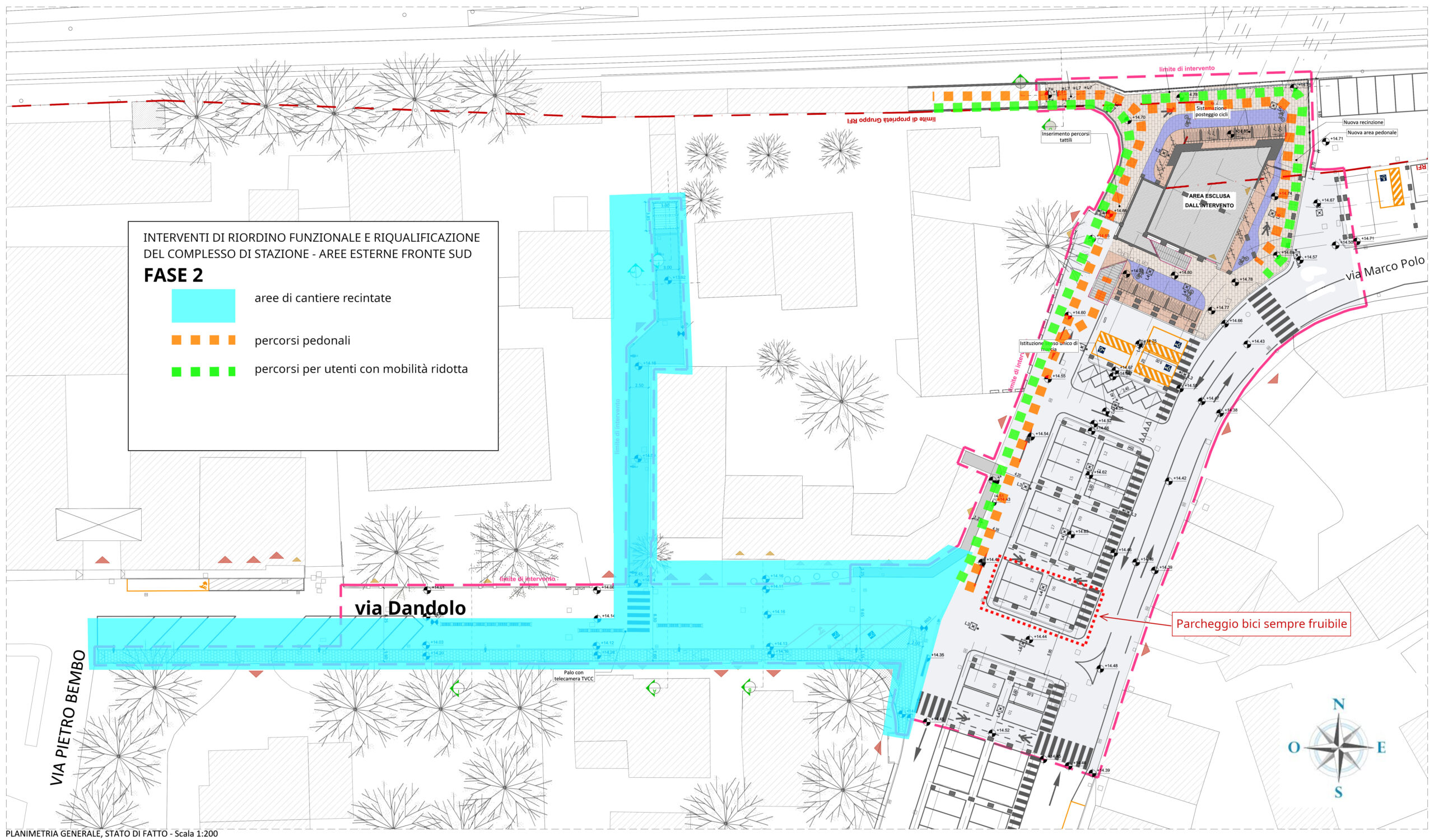 Al fine di garantire il regolare accesso alla stazione ferroviaria, i lavori saranno articolati in due distinte fasi. La prima, in programma a partire da giovedì 30 ottobre e presumibilmente fino a fine gennaio 2026, interesserà la rampa di uscita del sottopasso ferroviario lato Est e l’area sottostante il cavalcaferrovia. Durante tale periodo il traffico pedonale in ingresso e in uscita dalla stazione sarà consentito esclusivamente attraverso il percorso su via Dandolo, fatta eccezione per gli utenti con disabilità, per i quali sarà garantito l’utilizzo della rampa lato Est. La seconda fase, prevista dall’inizio di febbraio 2026 e della durata stimata di circa tre mesi, riguarderà invece il tratto di via Dandolo fino a via Bembo.