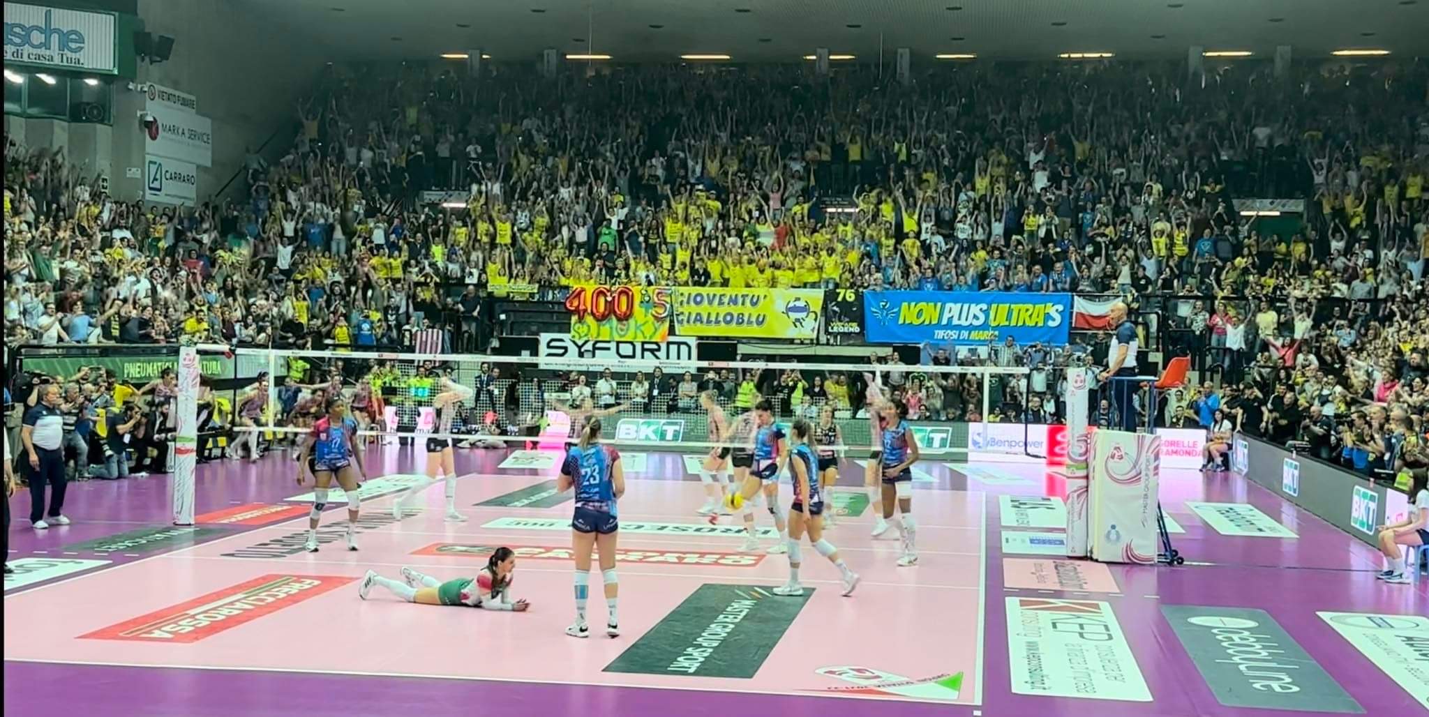 Quarto set. Thompson carica le compagne, 0-1, Fahr per l’uno pari e poi fa ace, 2-1. Thompson supera il muro, 2-2. Il martello di Haak fa male, 3-2. Si va avanti punto a punto, sino a quando arriva nuovamente Gray, 7-4. E’ Thompson che blocca la fuga, 7-5. Sylla sbaglia il servizio, troppo lungo, 8-5. Pazzesca Gray, 9-6. Mani fuori di Thompson, 9-7. Gray colpisce in faccia Thompson, 10-7. Si aggiunge anche Haak, 11-7. Pure l’ace trova Gray, 12-7. Larson per il 12-8. Diagonale di Haak che con un po’ di fortuna cade nel campo avversario, 13-8. Folie risponde subito 13-9. arriva Candi al servizio, e Sylla mura Haak, 13-10. Lubian subito per il cambio palla, 14-10. Stevanovic ha la meglio sulla spinta a rete, 14-11. L’Imoco mette fuori una palla e Santarelli chiama subito accanto a se la squadra, 14-12. Haak torna subito a macinare punti, 15-12. Stevanovic viene murata come anche Thompson, 17-12. E’ decisamente un momento cruciale della partita. Gaspari prova a rimettere ordine, ma Gray torna implacabile, 18-12. Sylla non riesce a tenere, 19-12. Conegliano regala il 13-esimo punto. Haak liberissima centralmente 20-13. Gray, mani fuori, 21-13. Set ormai deciso, ma Thompson non ci sta, 21-14. Fahr 22-14. Si arriva preso verso la fine, con il Palaverde che già festeggia sul 23-14. Poi tanti punti di attesa, ma alla fine arriva il punto dello scudetto sul 25-21.